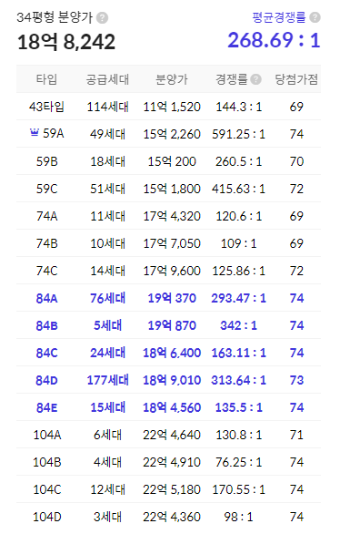 여기서 59A, 74A는 일반분양에 없습니다. (조합원 분양 완료)
