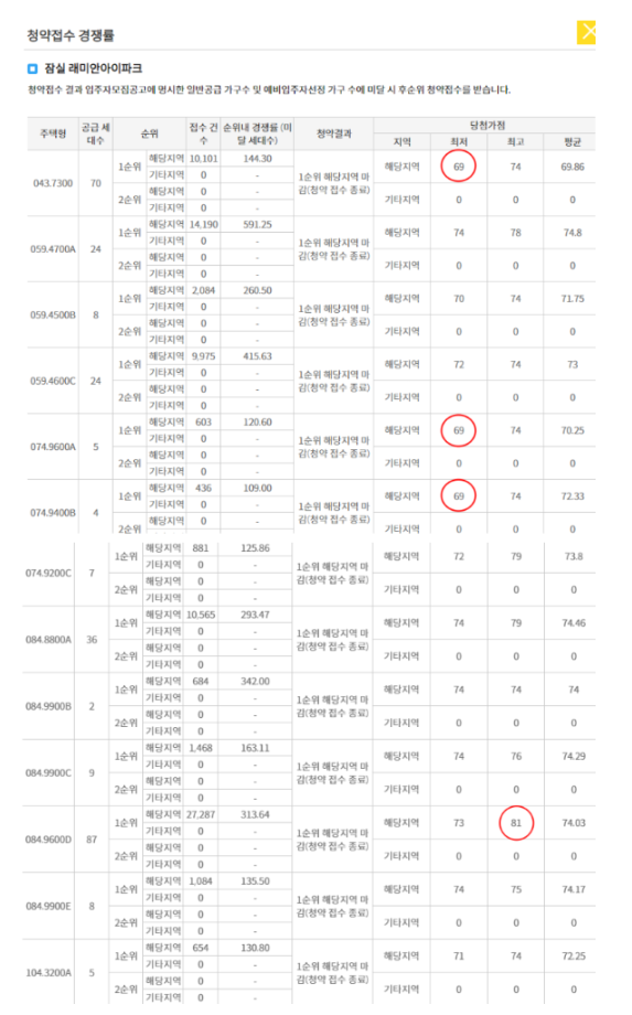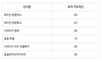 잠실 르엘, 헬리오시티 등 강남권 인기 단지들의 최저 커트라인은 69점~70점대 초반에서 형성되어 있으며, 이는 래미안 아이파크 위브의 경쟁 상황과 매우 유사합니다.