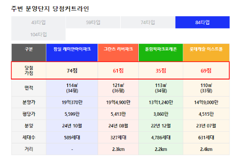 잠실 르엘 59㎡ 기준 최저 가점 70점 / 송파 헬리오시티 59㎡ 약 68점